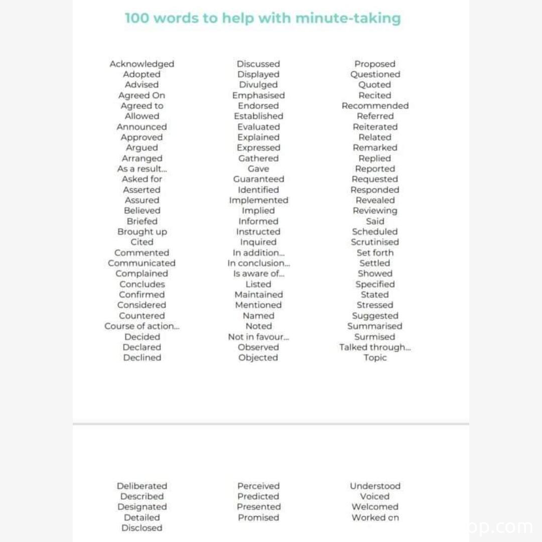 Home/Cool Guides/100 words to use when taking minutes for...๐ Cool Guides100 words to use when taking minutes for a meetingApr 15, 2022โข1 min read 100 words to use when taking minutes for a meeting Found this guide helpful? ๐ฅทShare on XAll Cool GuidesHome๐More Cool GuidesKeep exploring and learning128 words to use instead of veryRead โ128 words to use instead of veryRead โInformal and formal words to useRead โWords to use instead of veryRead โ16 Boring Words What to Use InsteadRead โWords to use instead of VeryRead โExplore All Cool Guides