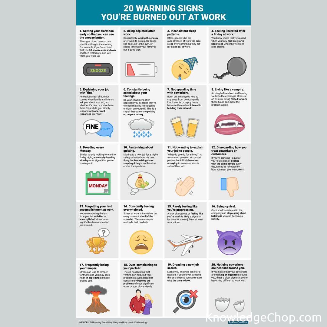 Home/Cool Guides/20 Warning Signs You’re Burnt Out at Wor...📊 Cool Guides20 Warning Signs You’re Burnt Out at WorkApr 16, 2022•1 min read 20 Warning Signs You’re Burnt Out at Work Found this guide helpful? 🥷Share on XAll Cool GuidesHome📊More Cool GuidesKeep exploring and learningAnxiety warning signsRead →Breast Cancer Warning SignsRead →Warning signs anxiety is setting inRead →Warning signs of a heart attackRead →Sept 6-12 is National Suicide Prevention Week in the US, aimed to inform and engage health professionals and the general public about suicide prevention and warning signs of suicide.Read →Cult Warning Signs and Red FlagsRead →Explore All Cool Guides