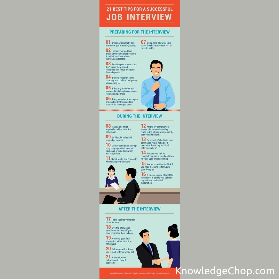 Home/Cool Guides/21 Tips for a Successful Job Interviewπ Cool Guides21 Tips for a Successful Job InterviewApr 12, 2022β’1 min read 21 Tips for a Successful Job Interview Found this guide helpful? π₯·Share on XAll Cool GuidesHomeπMore Cool GuidesKeep exploring and learningJob Interview GuideRead βHere are 12 things you should say in a job interview!Read βNinja Your Way Through Job Interviews: Expert Tips Tricks π₯·πΌRead βInterview Like a Ninja: 3 Stealthy Keys to Success π₯·πΌποΈRead βMy local hospital has a chart letting patients know what job the different colored scrubs indicateRead βWhich IT Job Is the Best?Read βExplore All Cool Guides