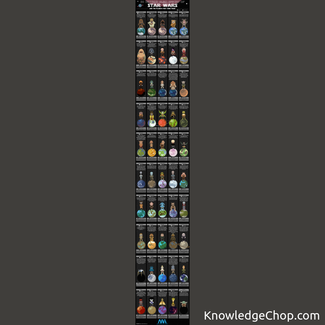 A cool infographic on 50 sentient alien species of Star Wars and the planets they come from.
