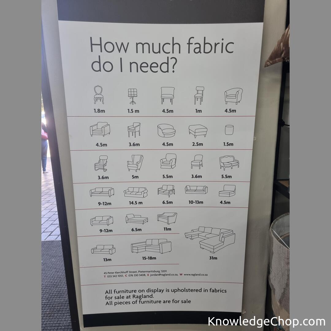A guide in a fabric shop as to how much fabric you need for different sized pieces of furniture