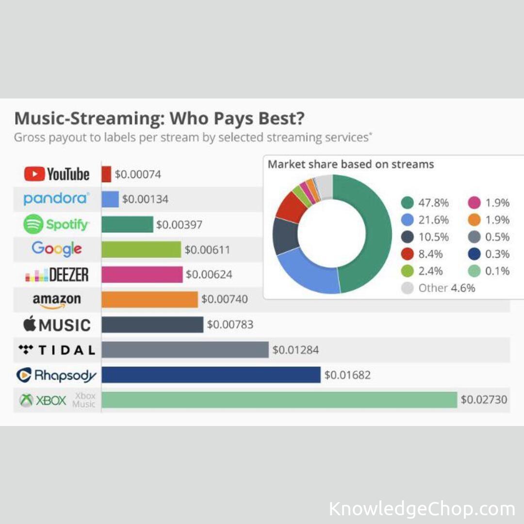 A guide to which streaming service pays the most to artists and their respective market shares based on amount of streams
