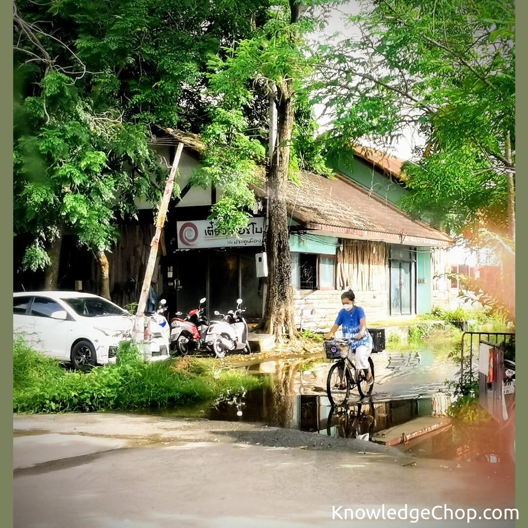 A lady cycles through a very flooded Khon Kaen, Thailand after monsoon rains