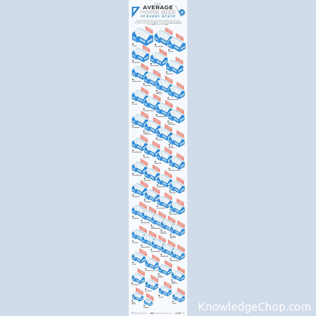 Average home size in each of the United States. (houses and condos only).