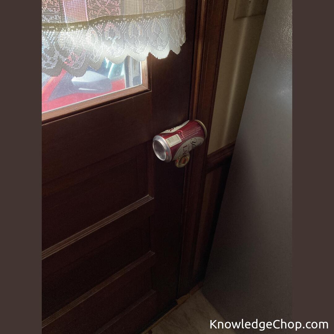 Balance an empty can on the doorknob to alert you if someone tries to open the door while you’re elsewhere in the house. There have been a few break-ins in my neighborhood recently.