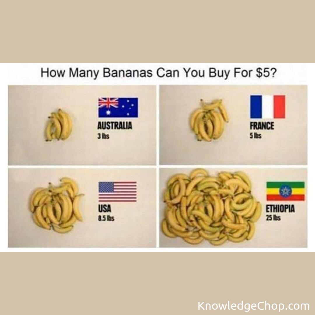 Next on our journey, we’ll swing across the Atlantic to the United States. ๐บ๐ธ Here, the land of opportunity lives up to its name by offering bananas for an average price of just $0.25 each, allowing you to purchase around 20 bananas for $5.
