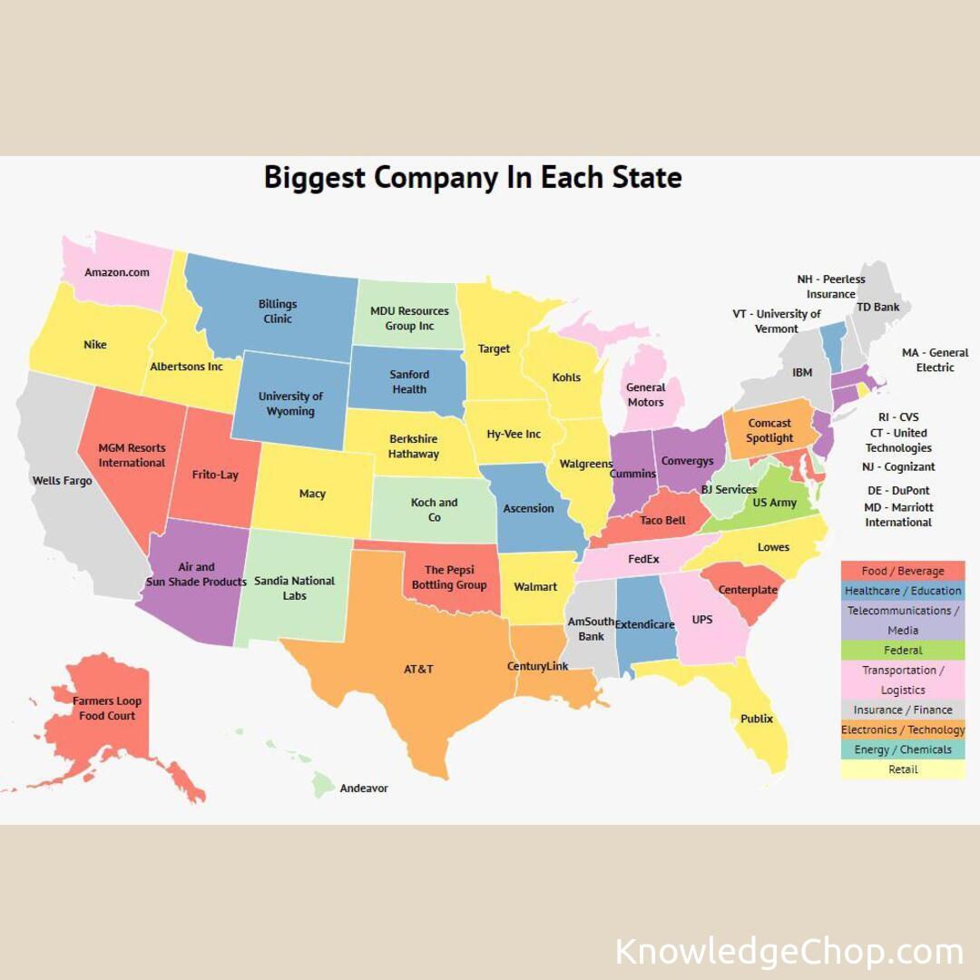 Home/Cool Guides/Biggest corporation in each state📊 Cool GuidesBiggest corporation in each stateMar 25, 2022•1 min read Biggest corporation in each state Found this guide helpful? 🥷Share on XAll Cool GuidesHome📊More Cool GuidesKeep exploring and learningBiggest Sources of Electricity by State and ProvinceRead →The Biggest Source of Power in every State and ProvinceRead →The Biggest Source of Power in every State and ProvinceRead →This is pretty cool from Visual Capitalist! The biggest employer in each state of the USA.Read →The biggest greenhouse gas emitters in the United StatesRead →The Way of the Traveler: A Ninja s Guide to US State Tourism LogosRead →Explore All Cool Guides