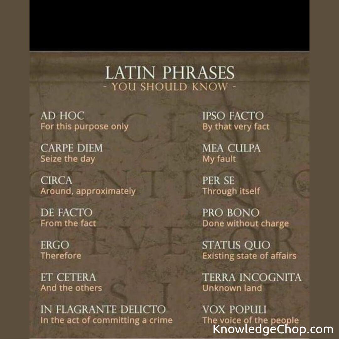 Home/Cool Guides/Common Latin Phrases, used in English📊 Cool GuidesCommon Latin Phrases, used in EnglishMay 25, 2022•1 min read Common Latin Phrases, used in English Found this guide helpful? 🥷Share on XAll Cool GuidesHome📊More Cool GuidesKeep exploring and learningQuick Greek guide to understading the most commonly used phrases and wordsRead →Latin Lingo: Unmasking the Masterful Phrases Every Knowledge Ninja Should KnowRead →Latin Phrases you should knowRead →English letters frequency in English words based on a sample of 40,000 words. Used usuelly for deciphering secret messages.Read →English letters frequency in English words based on a sample of 40,000 words. Used usuelly for deciphering secret messages.Read →Arabic origins of some English words (source: Arabic Phrases for Dummies)Read →Explore All Cool Guides