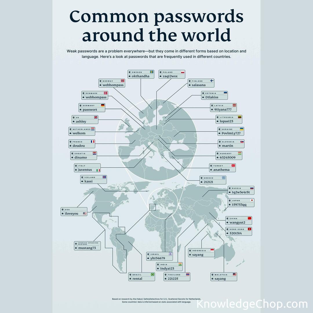Home/Cool Guides/Common passwords by country📊 Cool GuidesCommon passwords by countryMay 3, 2022•1 min read Common passwords by country Found this guide helpful? 🥷Share on XAll Cool GuidesHome📊More Cool GuidesKeep exploring and learningA Surname World Tour: Unraveling the Most Common Last Names in Each CountryRead →The most common last name in every countryRead →The most common last name in each country.Read →The most common dream in every country (https://mornings.co.uk/wp-content/uploads/2022/03/01_Dreaming-Across-Borders_World-Map_Hi-RES.png)Read →The most common dream in every country (https://mornings.co.uk/wp-content/uploads/2022/03/01_Dreaming-Across-Borders_World-Map_Hi-RES.png)Read →The most common dream in every countryRead →Explore All Cool Guides