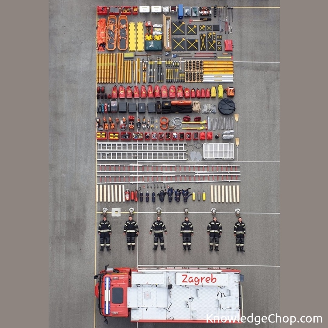 Check out the contents of a single fire truck! From street to city, this vehicle is essential for urban travel and safety. #Street #City #Travel #Urban #People #NoPerson #Business #Police #Vehicle #Security #Commerce #Building #Car #Competition #Soccer #Man #Signalise #Color
