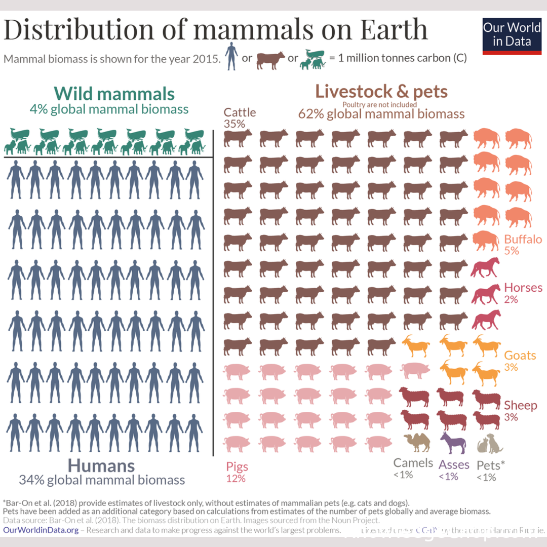 Distribution of Mammals on Earth; Humans and their domesticated animals represent 96% of all mammalian biomass on earth, whereas all wild mammals represent only 4%