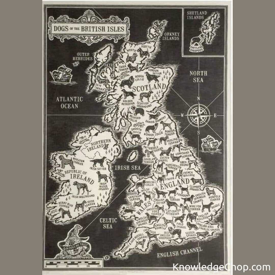 Check out this amazing illustration of the Dogs of the British Isles! From cartography to geography, this old engraving is a great way to learn about the countries and their coats of arms. #illustration #map #cartography #geography #margin #text #chalkout #symbol #people #old #engraving #education #print #art #vintage #country #coatofarms #school #atlas #antique