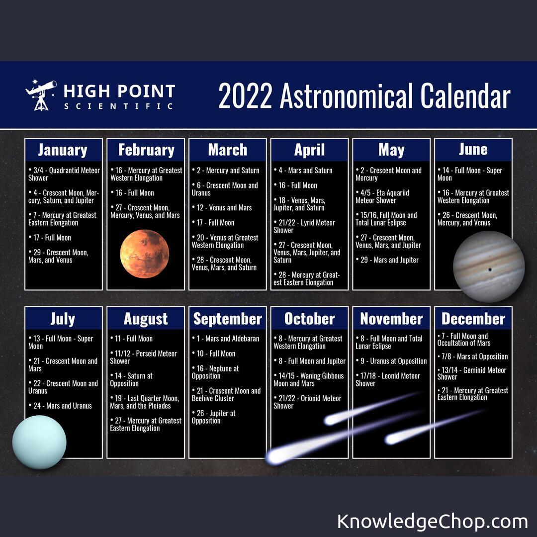 Easy to read 2022 astronomical calendar from High Point Scientific