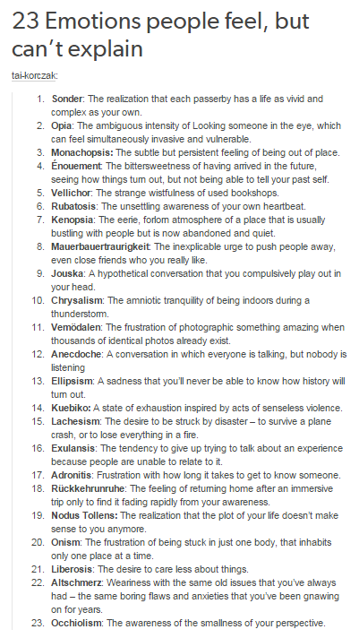 Home/Cool Guides/Emotions people feel but cannot explainπ Cool GuidesEmotions people feel but cannot explainJun 18, 2020β’1 min read Click for More Info Found this guide helpful? π₯·Share on XAll Cool GuidesHomeπMore Cool GuidesKeep exploring and learning23 emotions people feel but can t explainRead β23 emotions people feel, but can t explainRead βThe Support Menu I send to people I care about when they feel negative emotions πRead βI made this to explain how mRNA vaccines work as simply as I could to my family members. Feel free to use it/share it if you feel it would be useful to you! [OC]Read βI feel like this is critical information for some people.Read βHard to explain emotionsRead βExplore All Cool Guides