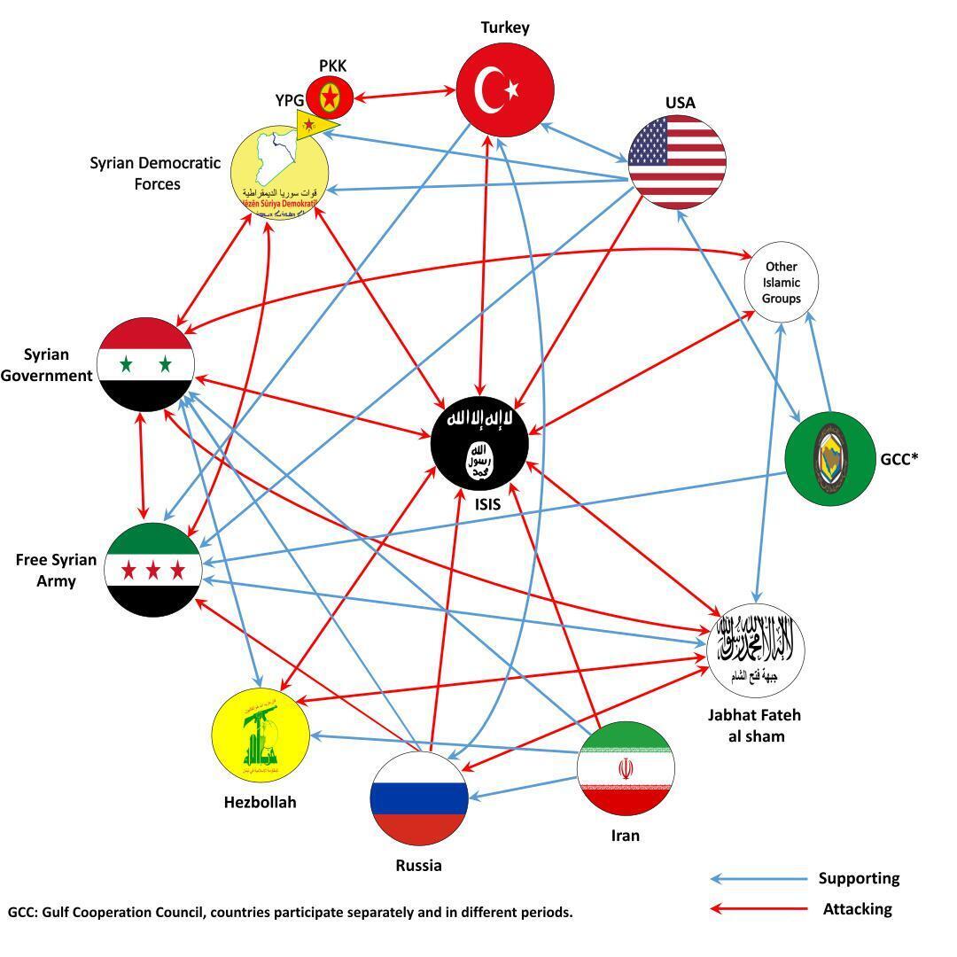 The Syrian civil war has created a complex web of enemies and allies. #Facts #Diagram #Chemistry #Research #Graph #Particle #Organization #Atom #Molecular #Physics #Wheel #Designing #Spherical #Connection #Data #Construction #Internet #Science #Education #Network