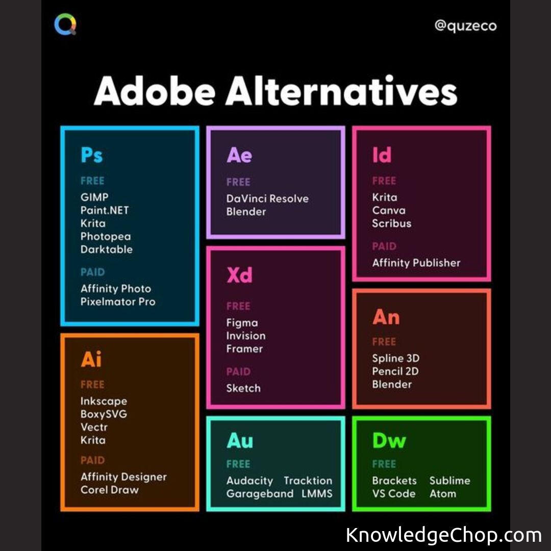 Home/Cool Guides/Free And Cheaper Adobe Alternativesπ Cool GuidesFree And Cheaper Adobe AlternativesSep 23, 2022β’1 min read Free And Cheaper Adobe Alternatives Found this guide helpful? π₯·Share on XAll Cool GuidesHomeπMore Cool GuidesKeep exploring and learningSome Adobe products and Its Free alternatives.Read βFree Software, Ninja Style: Unmasking Top-Notch Alternatives to Costly ProgramsRead βI got tired of seeing that outdated list of alternatives so I made my own. Feel free to repost for the next decade or soRead βFree alternatives to paid software (updated)Read βFree alternatives to paid softwareRead βExtensive List Of Alternatives To Adobe ProductsRead βExplore All Cool Guides