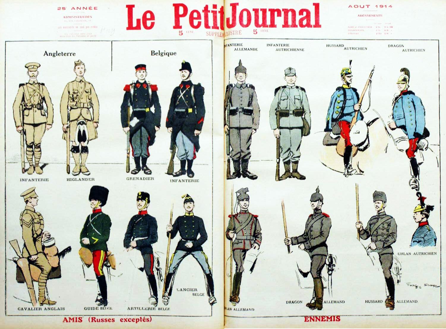 French friend/foe guide showing uniforms of their enemies (Germany, A-H Empire) and allies (Britain, Belgium) from start of WW1, 1914
