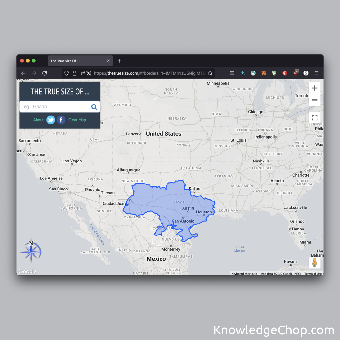 from thetruesize.com: Ukraine is about the size of Texas. If you’ve ever driven through Texas – it is not small.