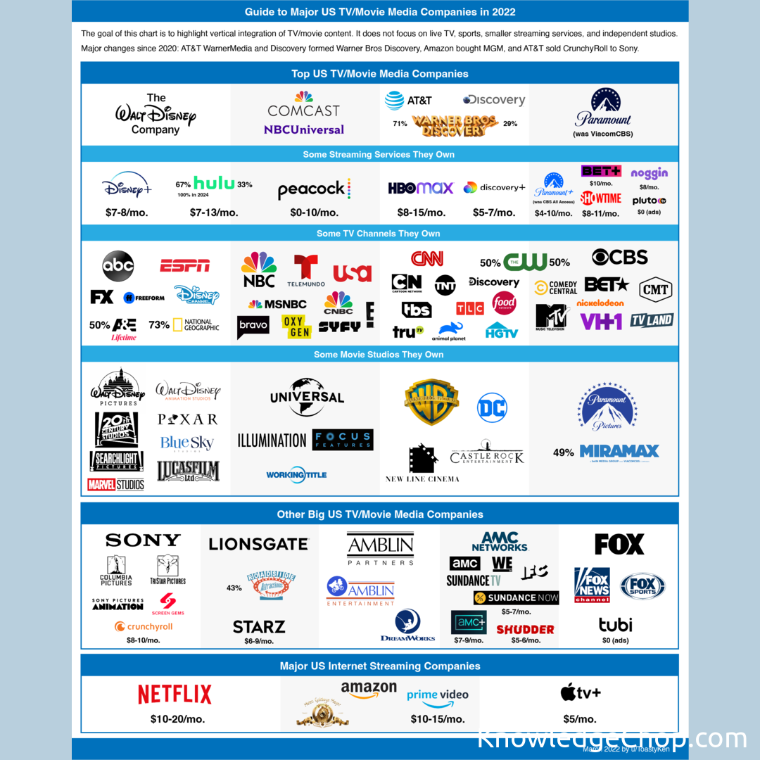 Guide to vertical integration of major US TV/movie media companies, highlighting what streaming services, channels, and studios they own in 2022 [OC]