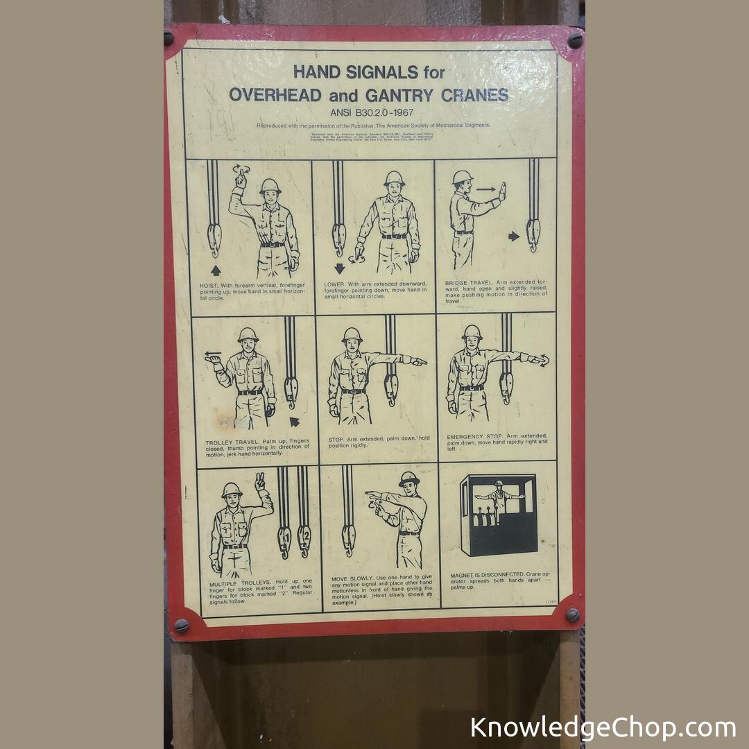 Hand signals for overhead and gantry cranes. Found in a power plant doing contactor work.