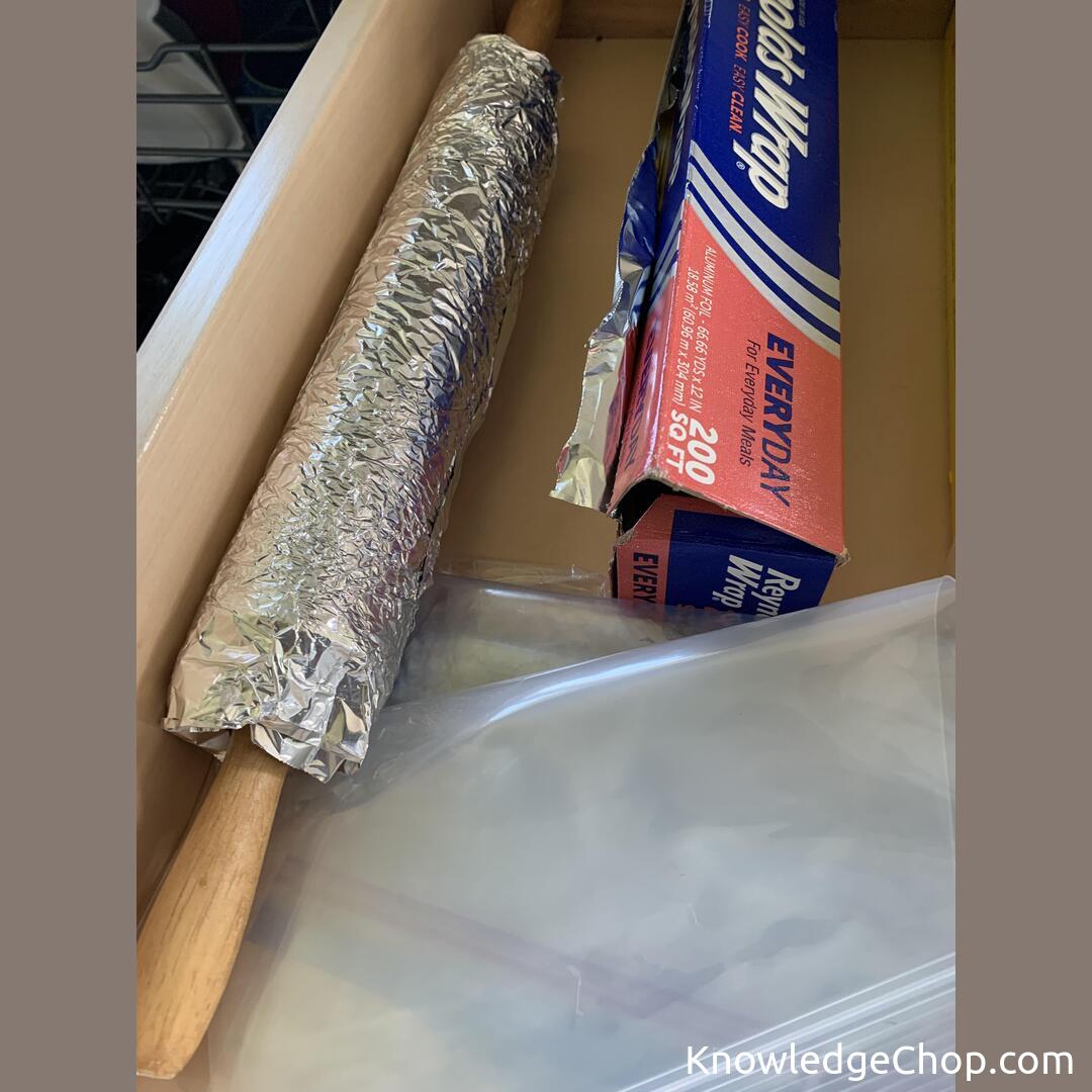 Helpful hack to reuse aluminum foil. Give your rolling pin a new job.