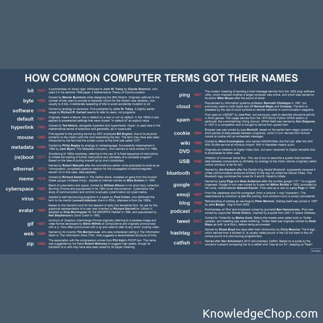Home/Cool Guides/How common computer terms got their name...📊 Cool GuidesHow common computer terms got their namesJan 3, 2023•1 min read How common computer terms got their names Found this guide helpful? 🥷Share on XAll Cool GuidesHome📊More Cool GuidesKeep exploring and learningHow computer languages got their namesRead →I made a guide showing how different colors got their names!Read →I made a guide explaining how different types of Halloween candy got their namesRead →I made a guide explaining how different infectious disease got their namesRead →I made a guide explaining how fish got their names!Read →I made a guide explaining how some birds got their namesRead →Explore All Cool Guides