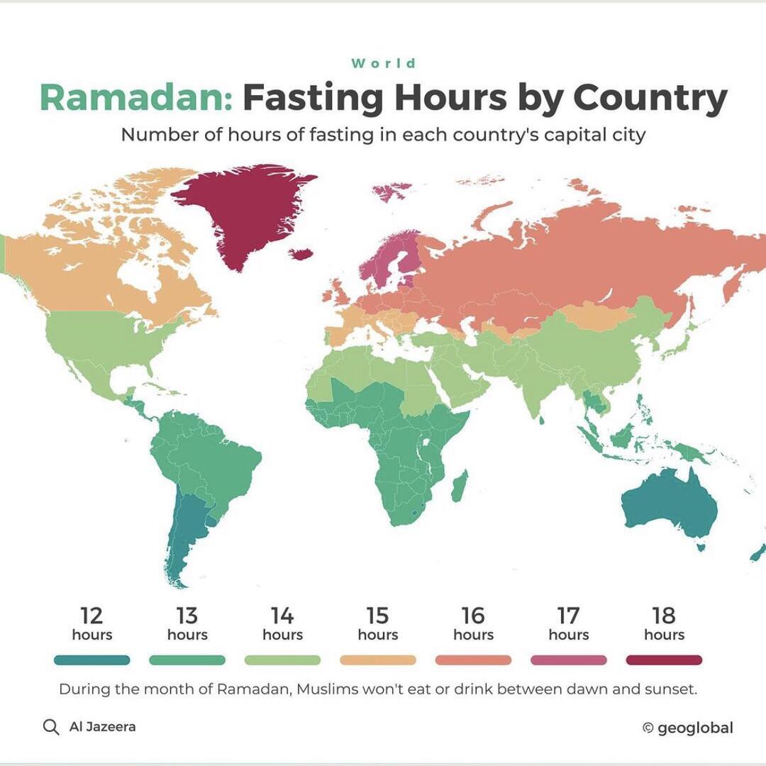 Do you know how long you have to fast during Ramadan based on your local sunlight hours? #Map #Geography #Cartography #Atlas #Country #Continent #Margin #Graph #Spherical #BallShaped #Soil #Location #Territory #Illustration #Vector #Navigation #Travel #Facts #Outline