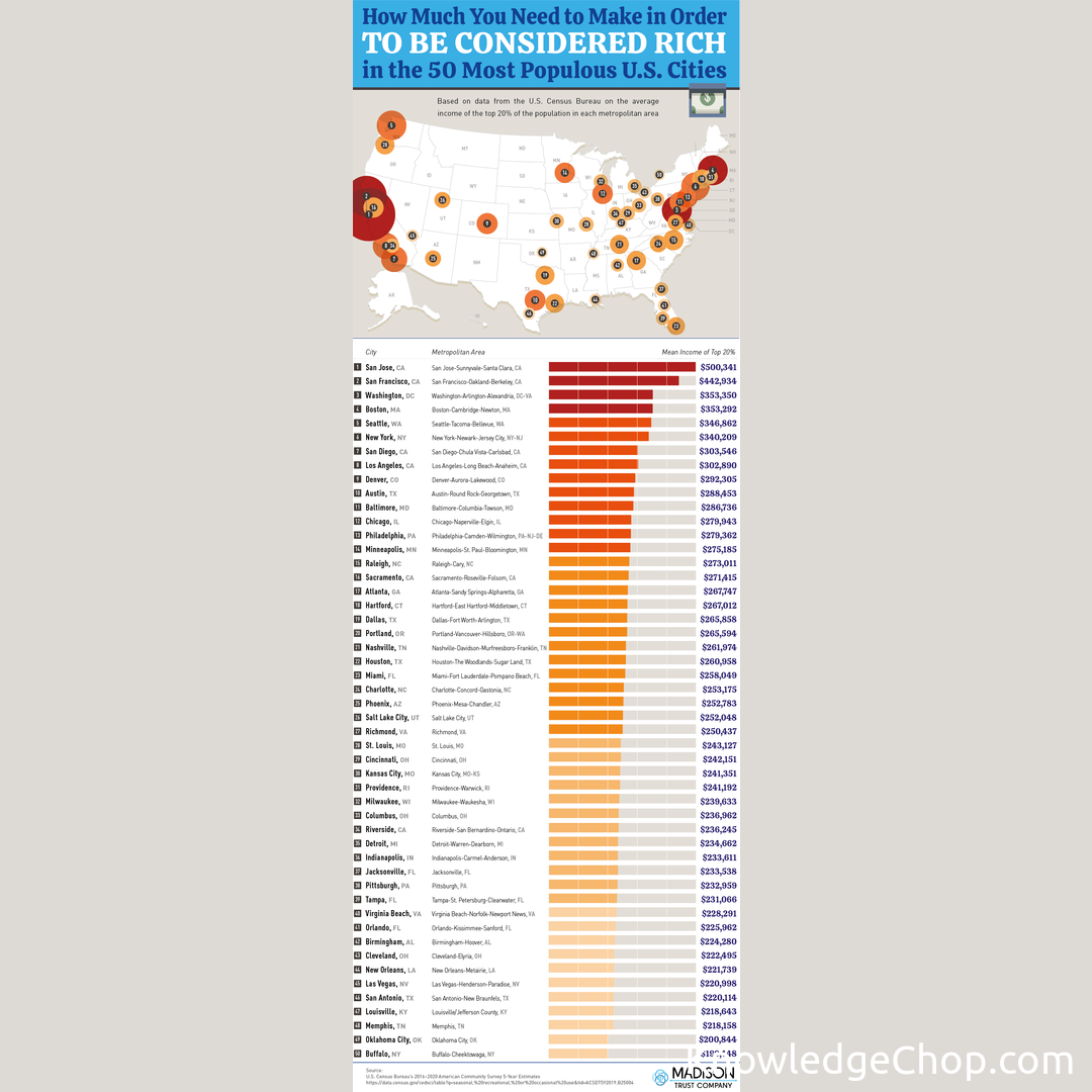 Ever wondered how much money you need to make to be considered rich in the 50 most populous cities in the United States? Check out our new infographic to find out! #Facts #Numbers #Abstract #Banner #Annual #Date #Card #Template #Page #Vector #Illustration #Stripe #Graphic #Monthly #Schedule #DailyOccurence #Desktop #Time #Design #Diary