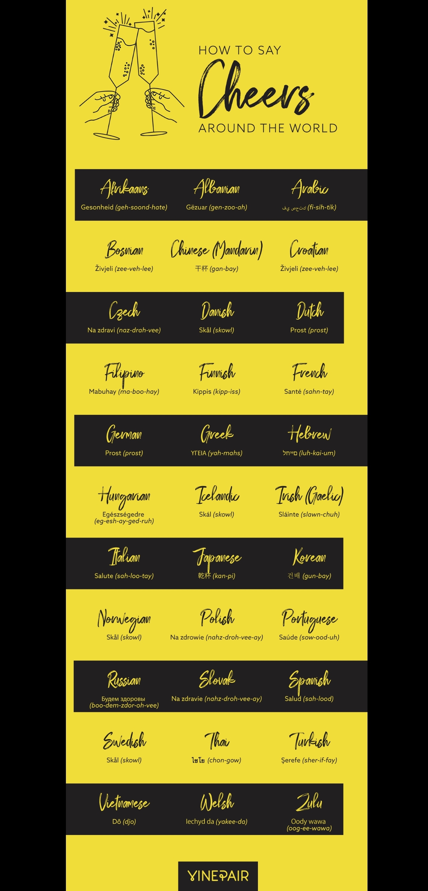 Home/Cool Guides/How to say Cheers in different languages📊 Cool GuidesHow to say Cheers in different languagesDec 7, 2019•1 min read Click for More Info Found this guide helpful? 🥷Share on XAll Cool GuidesHome📊More Cool GuidesKeep exploring and learningHow To Say I Love You In 50 Different Languages ♥️Read →How To Say I Love You In 50 Different Languages ♥️Read →How To Say I Love You In 50 Different Languages ♥️Read →How different countries in Europe say woofRead →Numbers in different Indian languages.Read →How to identify different languages with Cyrillic letters.Read →Explore All Cool Guides