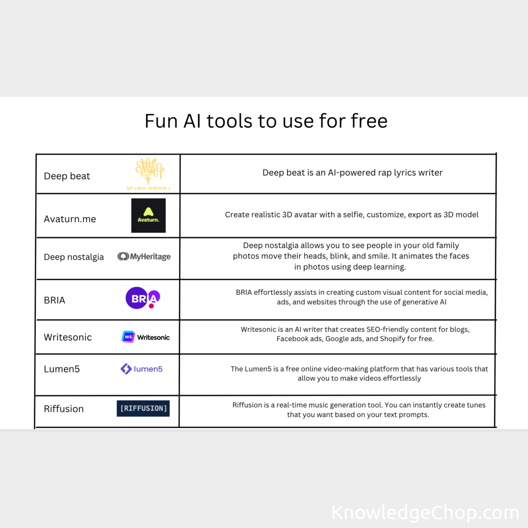 I created a small list of free AI tools. I know there are lots but here are some new ones I m playing around with. Does anyone have suggestions for some out the box ones. Like not super well-known?