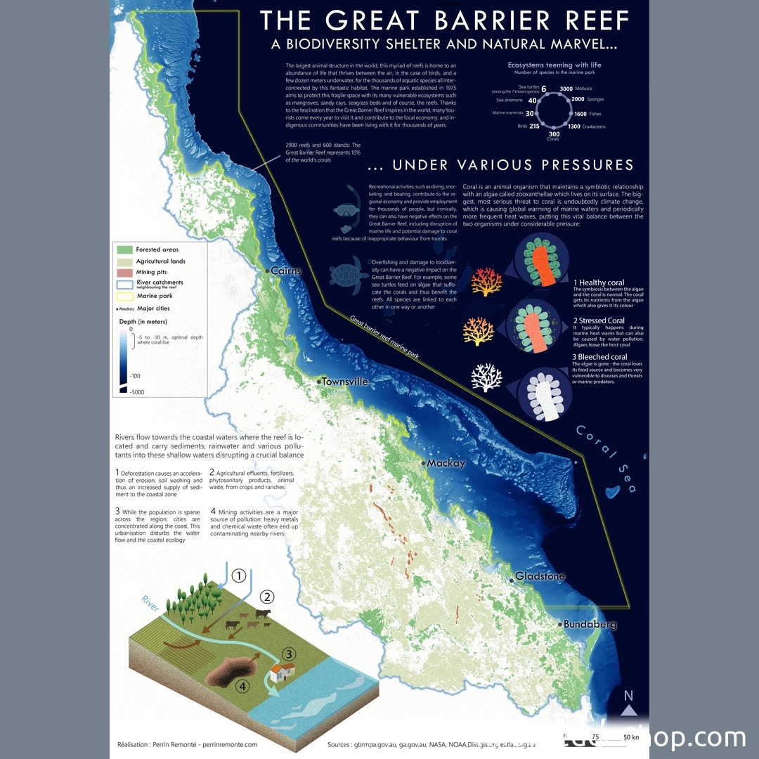 I made a map / infographic showing everything you need to know about the Great Barrier Reef, it s biodiversity and the challenges it s facing today ! Hope you enjoy it :)