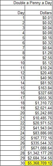I thought this was relevant considering the current global crisis. I use this example to teach exponential growth to seventh graders. Would you rather be given $1,000,000, or receive a penny on the first of the month and have it double every day for the month?