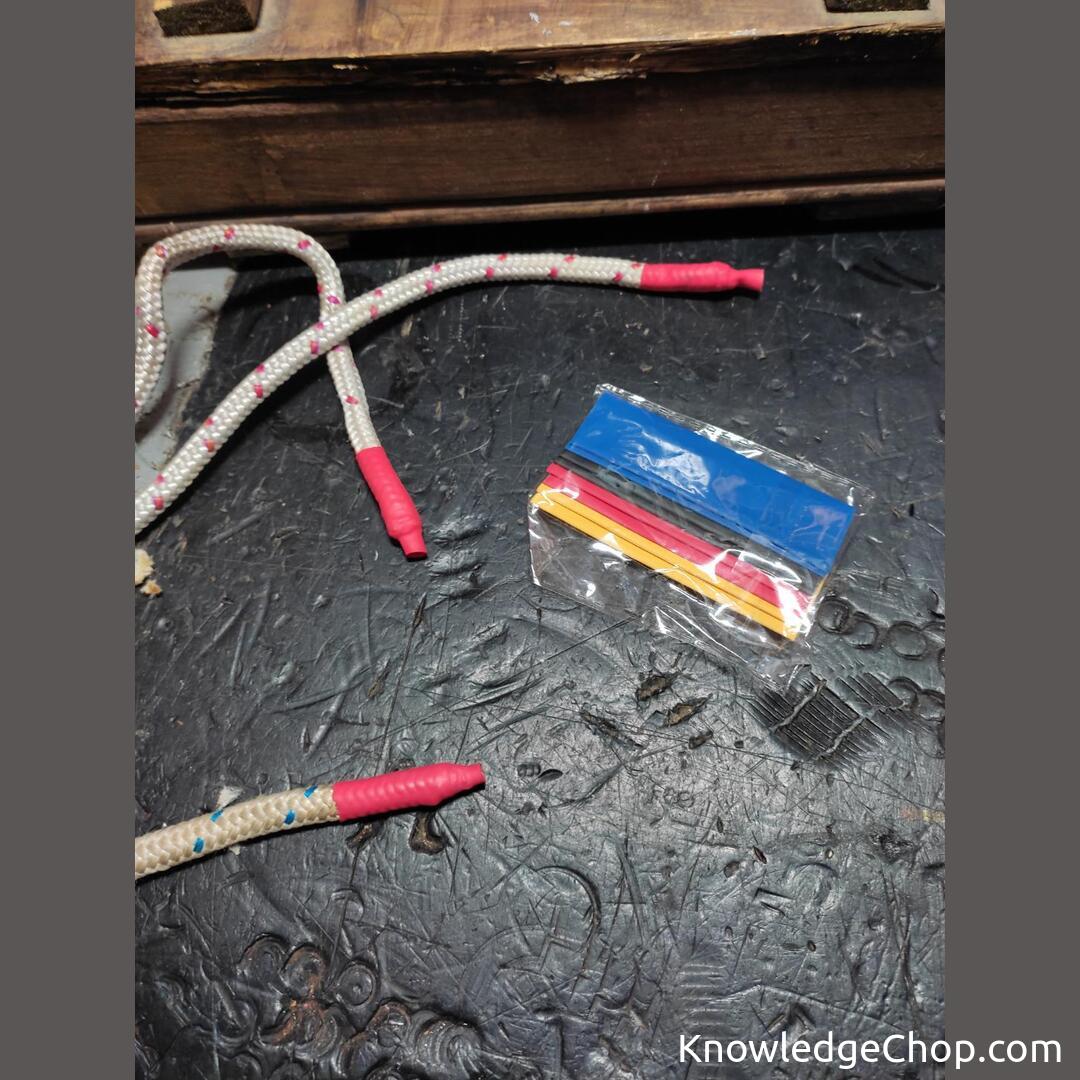 if you have ropes or strings that have started to loose thread you can use electrical shrinking connections, heat and, voilà, no more strings everywhere