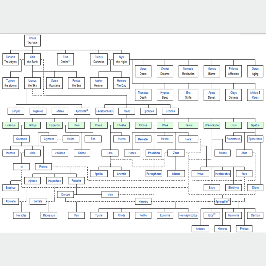 In case you ever wanted a comprehensive family tree of all the ancient Greek Titans, gods and goddesses