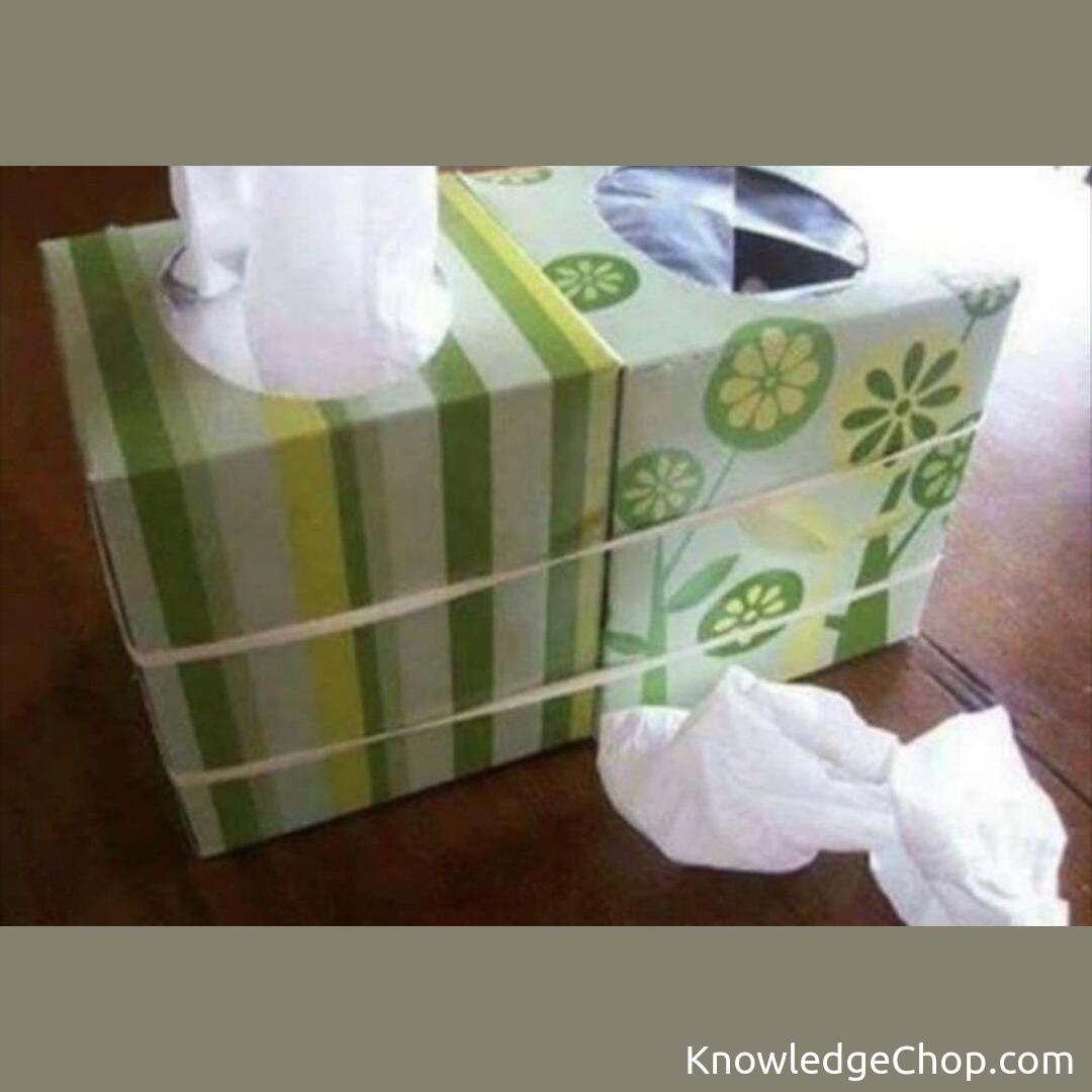 Join an empty tissue box to your new one with some rubber bands, for an instant used tissue disposal.
