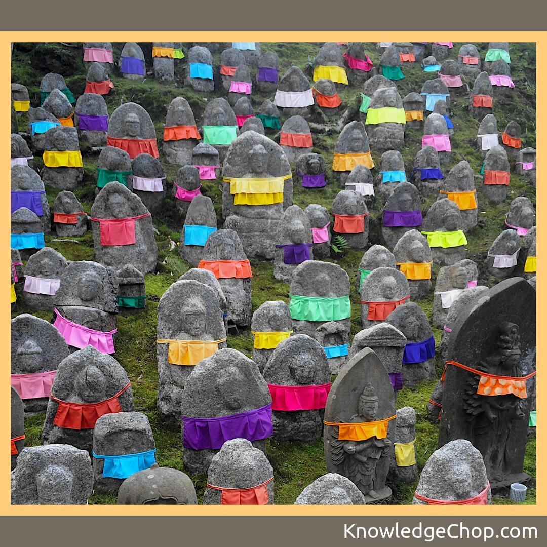 Kiyomizu-Dera Temple, Kyoto, Japan. Parents who have lost a child place the bibs on the nearly 200 Buddha statues to thank Jizo, the spirit that protects unborn children.