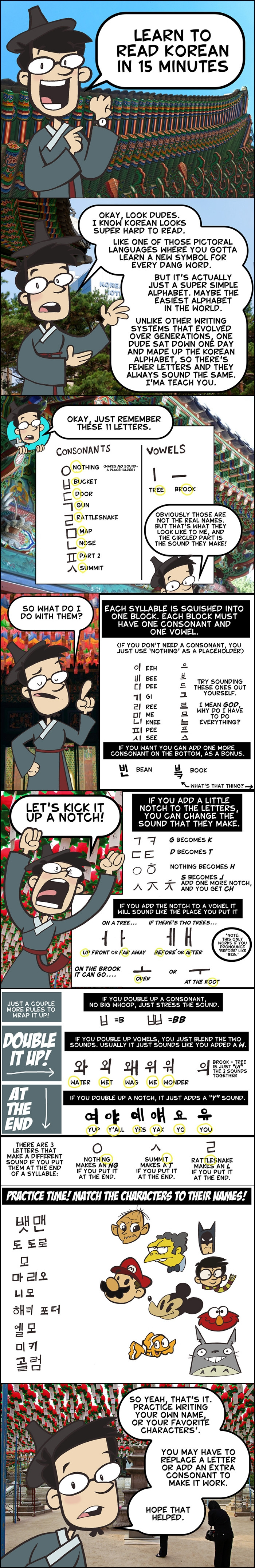 Home/Cool Guides/Learn the Korean Alphabet in 15 minutes!๐ Cool GuidesLearn the Korean Alphabet in 15 minutes!May 13, 2020โข1 min read Click for More Info Found this guide helpful? ๐ฅทShare on XAll Cool GuidesHome๐More Cool GuidesKeep exploring and learningLearn to Read Korean in 15 MinutesRead โLearn to Read Russian in 15 MinutesRead โLearn to read Russian in 15 minutesRead โMorse Code Alphabet- 3 Tricks For Learning it QuicklyRead โI saw the post on learning Korean easily and remember this exists. It s called ChinEasy!Read โWhich Programming Language Should You Learn First? A Ninjaโs Guide to Coding Success! ๐ฅท๐Read โExplore All Cool Guides
