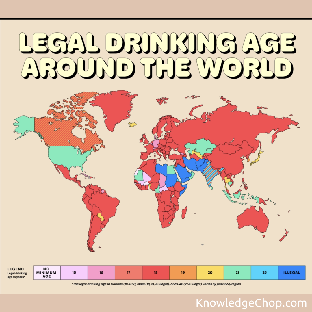 Check out this amazing map of the legal drinking ages across the world! #Map #Geography #Cartography #Country #Atlas #Continent #Illustration #Margin #Outline #International #Vector #Symbol #Spherical #Location #Travel #Ball-Shaped #Desktop #Image #Graph #Card
