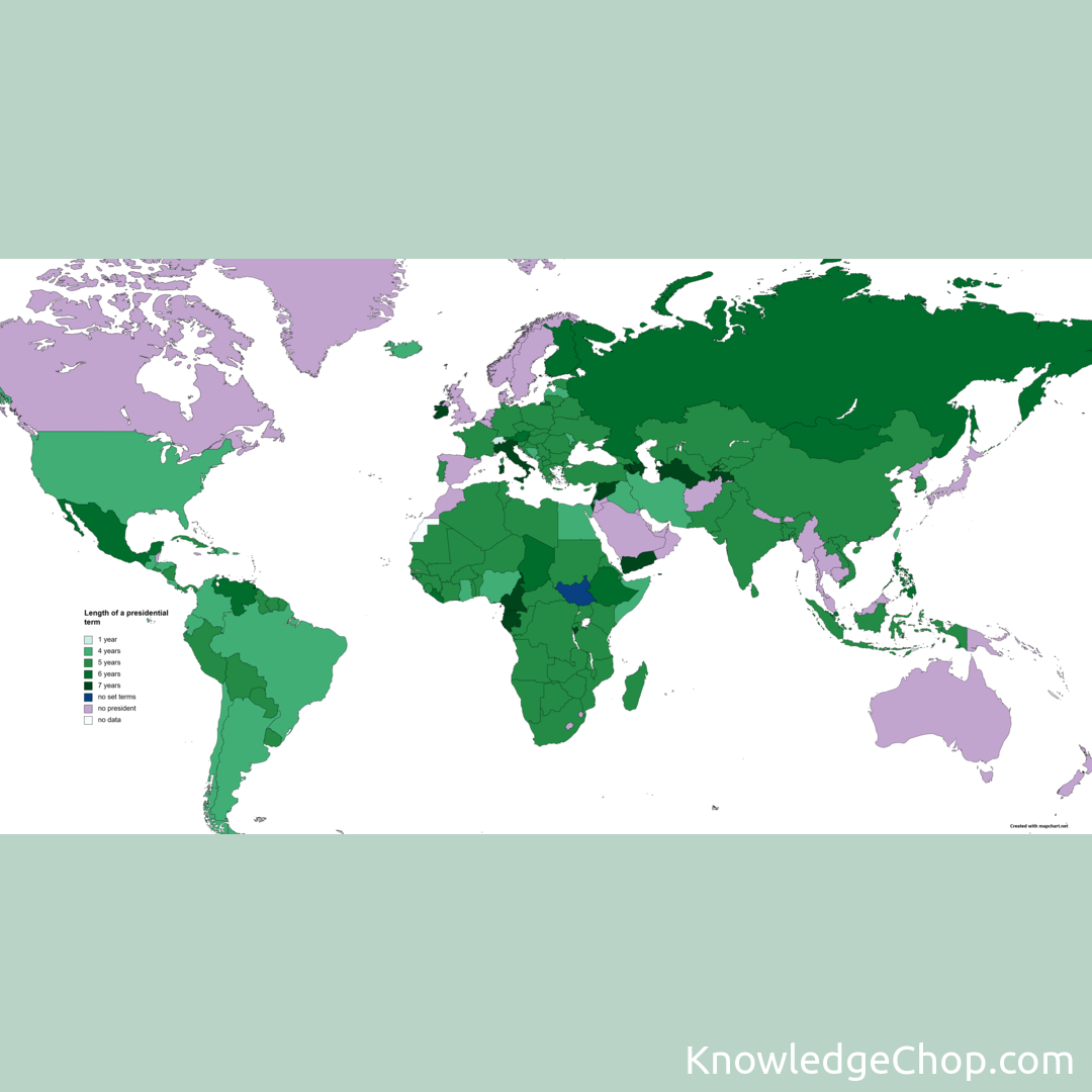 Did you know that the length of a presidential term varies around the world? Check out this #map to learn more about the #geography of different #Continent and #country presidential terms! #cartography #atlas #ball-shaped #soil #margin #spherical #International #topography #universe #planet #outline #travel #contour #territory #relief #location