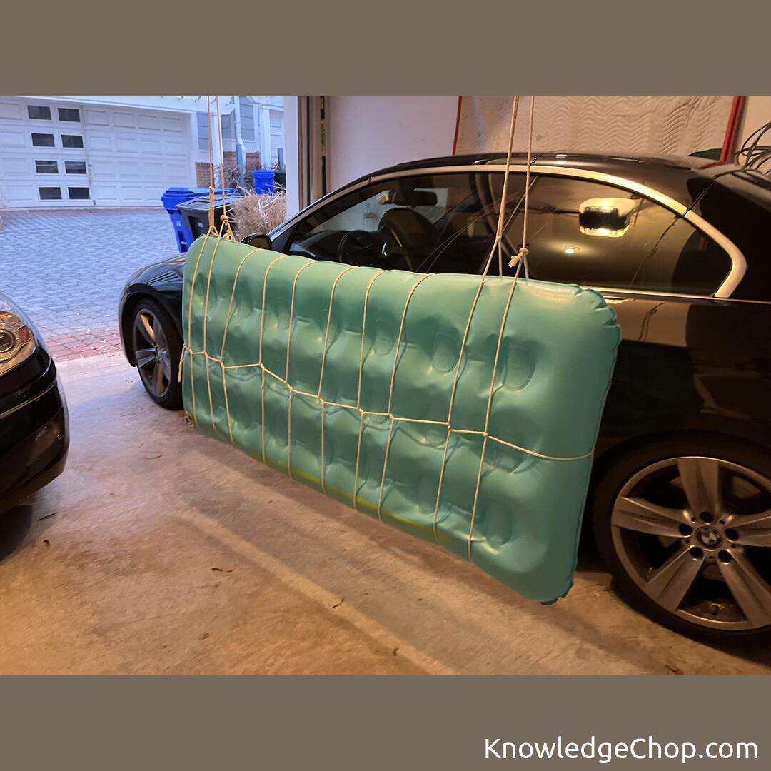 LIFEHACK: Truss a raft like a roast and hang it in your garage to prevent door dings.