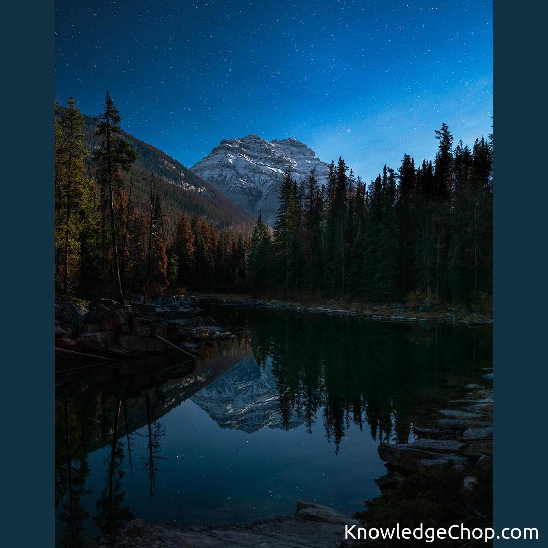 Moonlit reflections at Horseshoe Lake in Jasper National Park, Alberta, Canada [1648×2048] [OC] @jackfusco