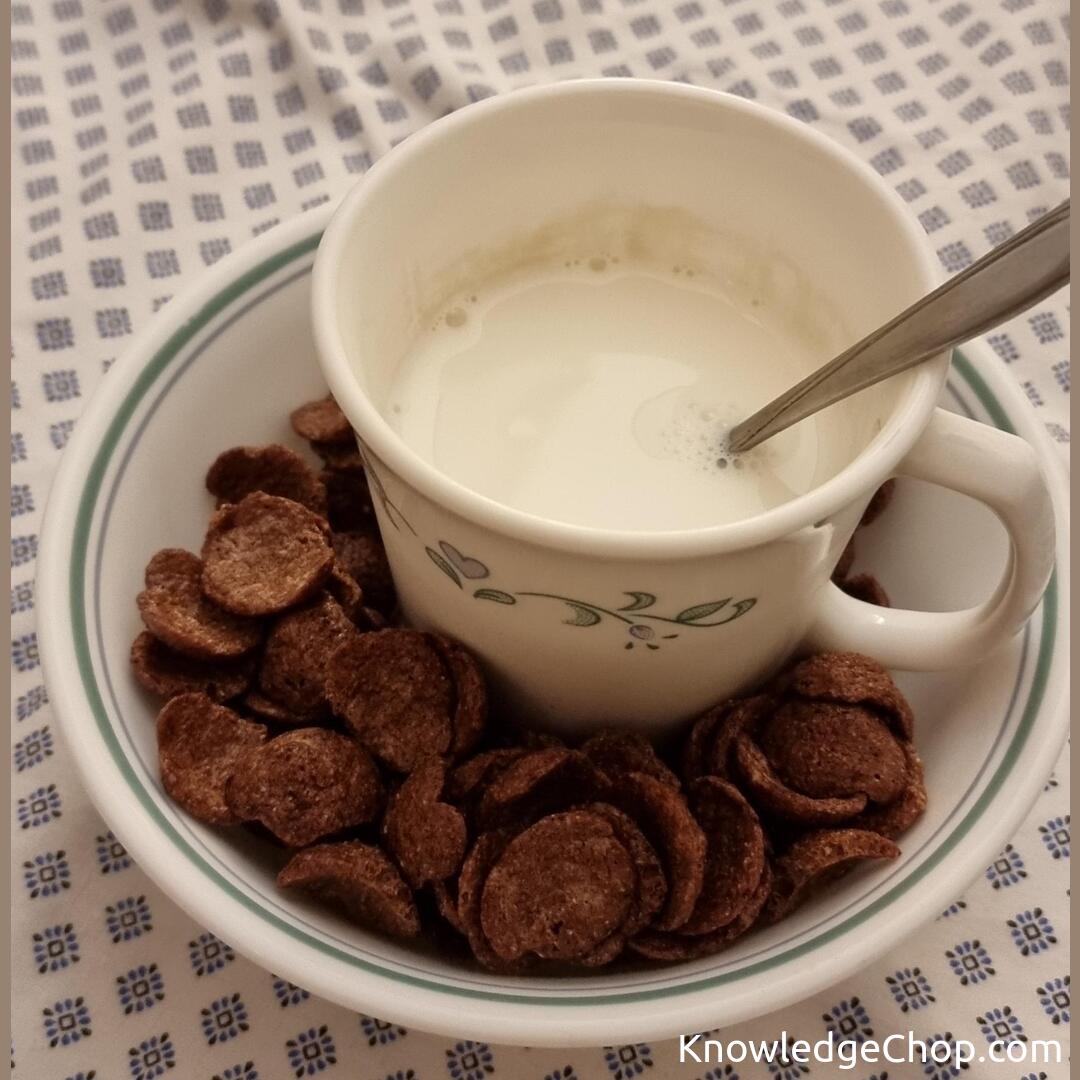 my setup. milk mug in middle. cereal supply all around. keep adding the cereal to the milk in small batches. and at the end easy to consume the flavored milk too.