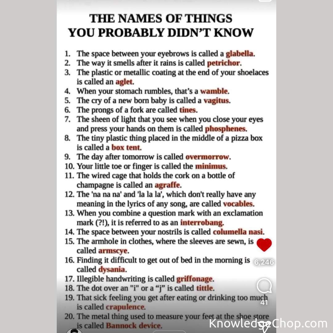 Home/Cool Guides/Names of things you probably didn’t know📊 Cool GuidesNames of things you probably didn’t knowDec 25, 2022•1 min read Names of things you probably didn’t know Found this guide helpful? 🥷Share on XAll Cool GuidesHome📊More Cool GuidesKeep exploring and learningThe name of things that you probably didn’t knowRead →The name of things you probably didn’t knowRead →What probably you didn t know about buffaloes. They never forget some one who harassed them . Like the elephant, the African buffalo is renowned for its exceptional memory. They are known to ambush and attack hunters that have wounded or injured them – even years later!Read →Honestly didn t know they all had different names.Read →Honestly didn t know they all had different names.Read →Handy computer tricks you probably didn t know existed. I don t know if this has been posted beforeRead →Explore All Cool Guides