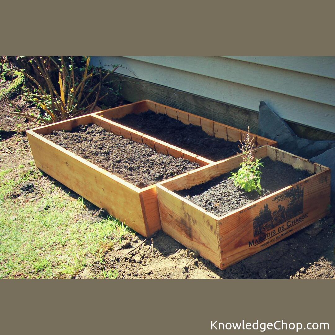 Old wooden shelving unit and vintage wine box repurposed into raised garden beds.