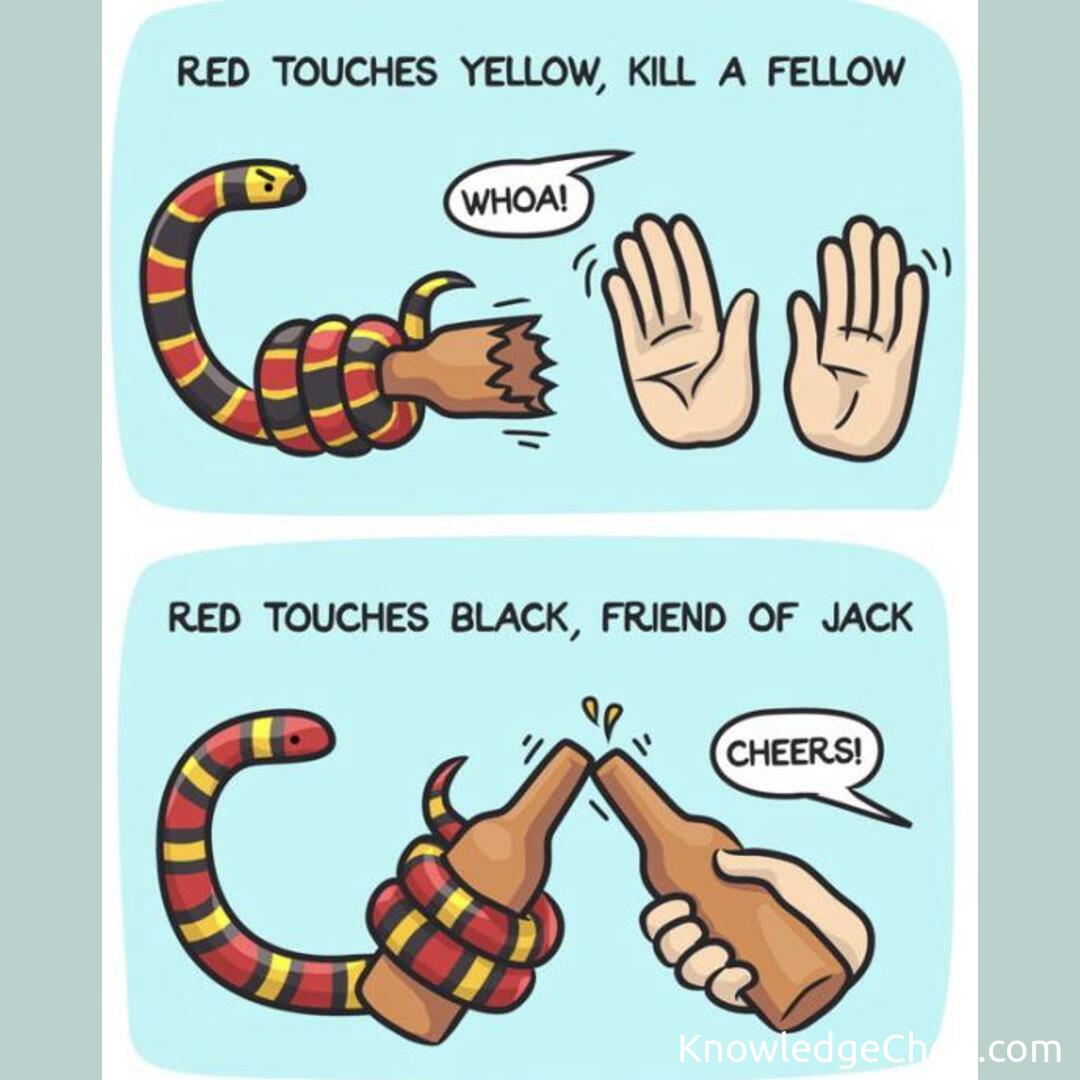 Coral snakes pack a venomous bite, while Scarlet king snakes are harmless. How can we quickly tell these doppelgangers apart? ๐ค It’s all in their vibrant colors: red, yellow, and black. In a Coral snake, the red and yellow rings touch, while in a Scarlet king snake, red and black rings touch. Remember, “red to yellow, kill a fellow; red to black, friend of Jack!” ๐