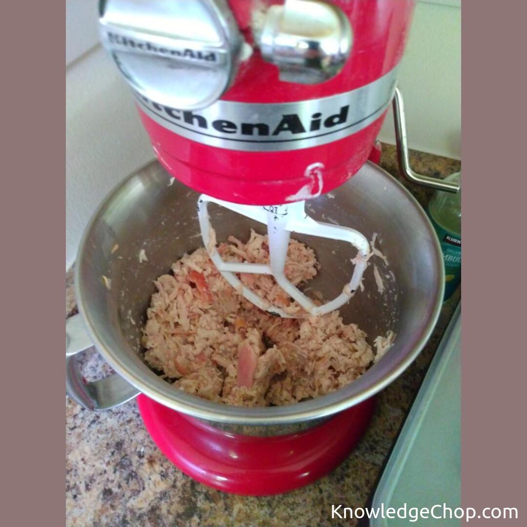 strip the meat from your rotisserie chicken, 20 seconds in the mixing bowl, and it’s perfectly shredded.