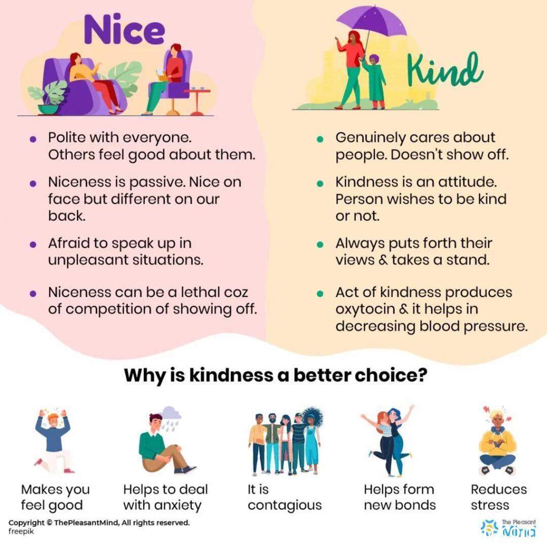 Being “nice” is an outward, surface-level behavior that entails following etiquette, avoiding confrontation or offense, and often consisting of superficial, temporary actions. It can be handy during brief encounters or to maintain a veneer of harmony. However, being “nice” can also lead to inauthentic interactions and, at times, enable negative behavior.