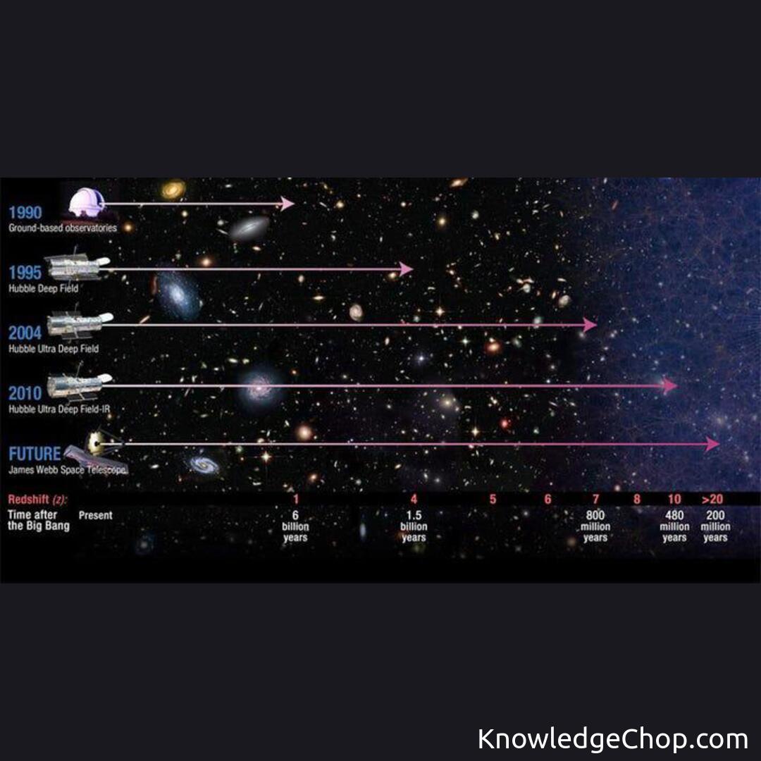 The James Webb will look back in time to just 200 million years after the Big Bang, or about 13,570,000,000 years ago… (and about 13.57 billion light years away). When the very first galaxies formed: