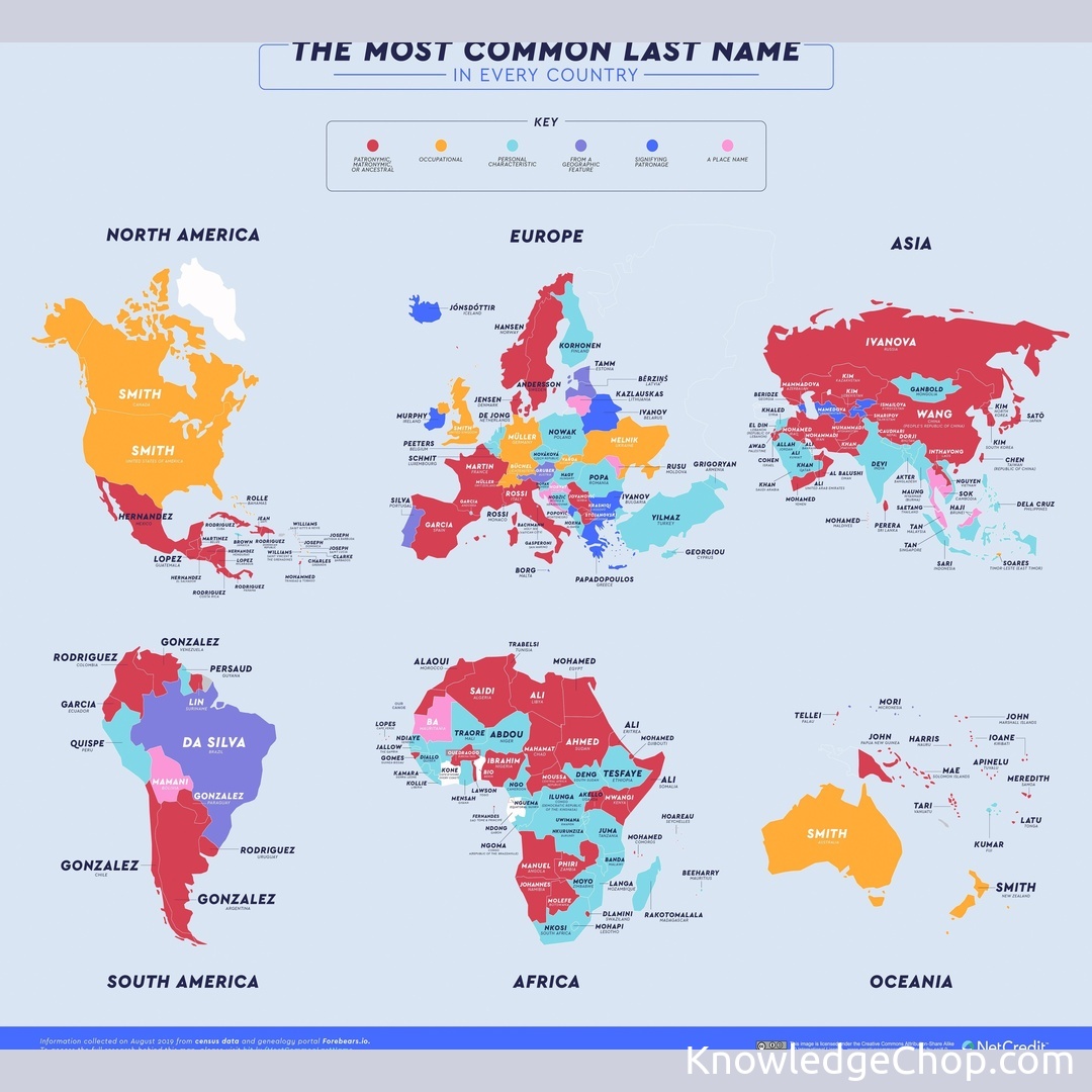 Check out this amazing map that shows the most common last name in every country! #Map #Graph #Cartography #Facts #Geography #Ball-Shaped #Atlas #Country #Travel #Symbol #Vectors #Navigation #Spherical #Arrow #Continent #Presentation #NoPerson #Vector #Image #Illustration