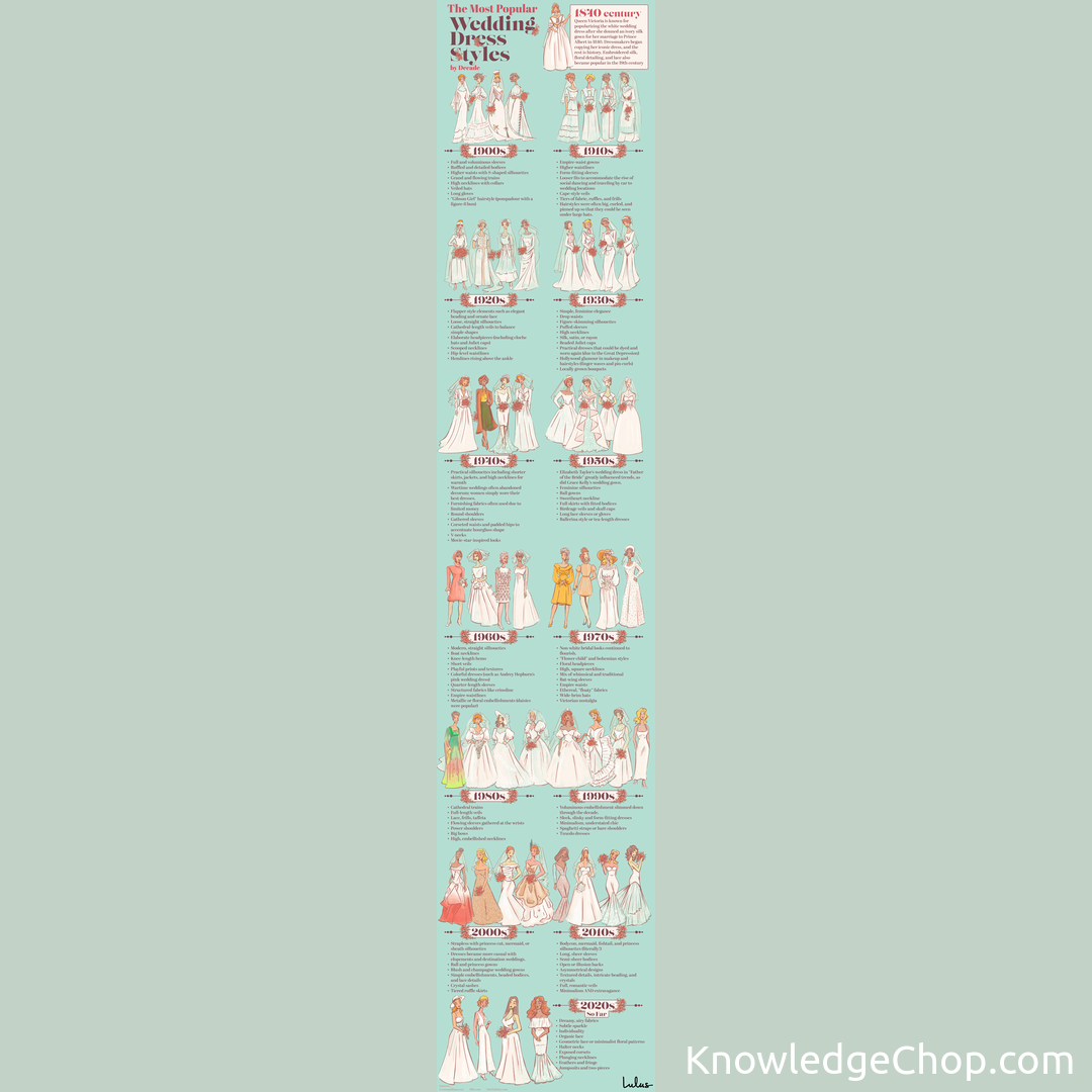 Check out the most popular wedding dress styles from each decade! From retro to modern, there’s something for everyone. #Woman #Illustration #Retro #Fashion #NoPerson #Vector #Set #Design #Card #Young #Elegant #Booklet #Text #Dress #Art #Summer #Wedding #Love #Style #People
